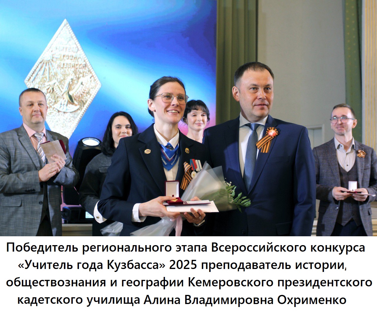 По итогам конкурса золотой почетный знак «Учитель года Кузбасса» был вручён победителю регионального этапа – преподавателю истории, обществознания и географии Кемеровского президентского кадетского училища Алине Владимировне Охрименко. Пять лауреатов регионального этапа были награждены серебряным почетным знаком «Учитель года Кузбасса».